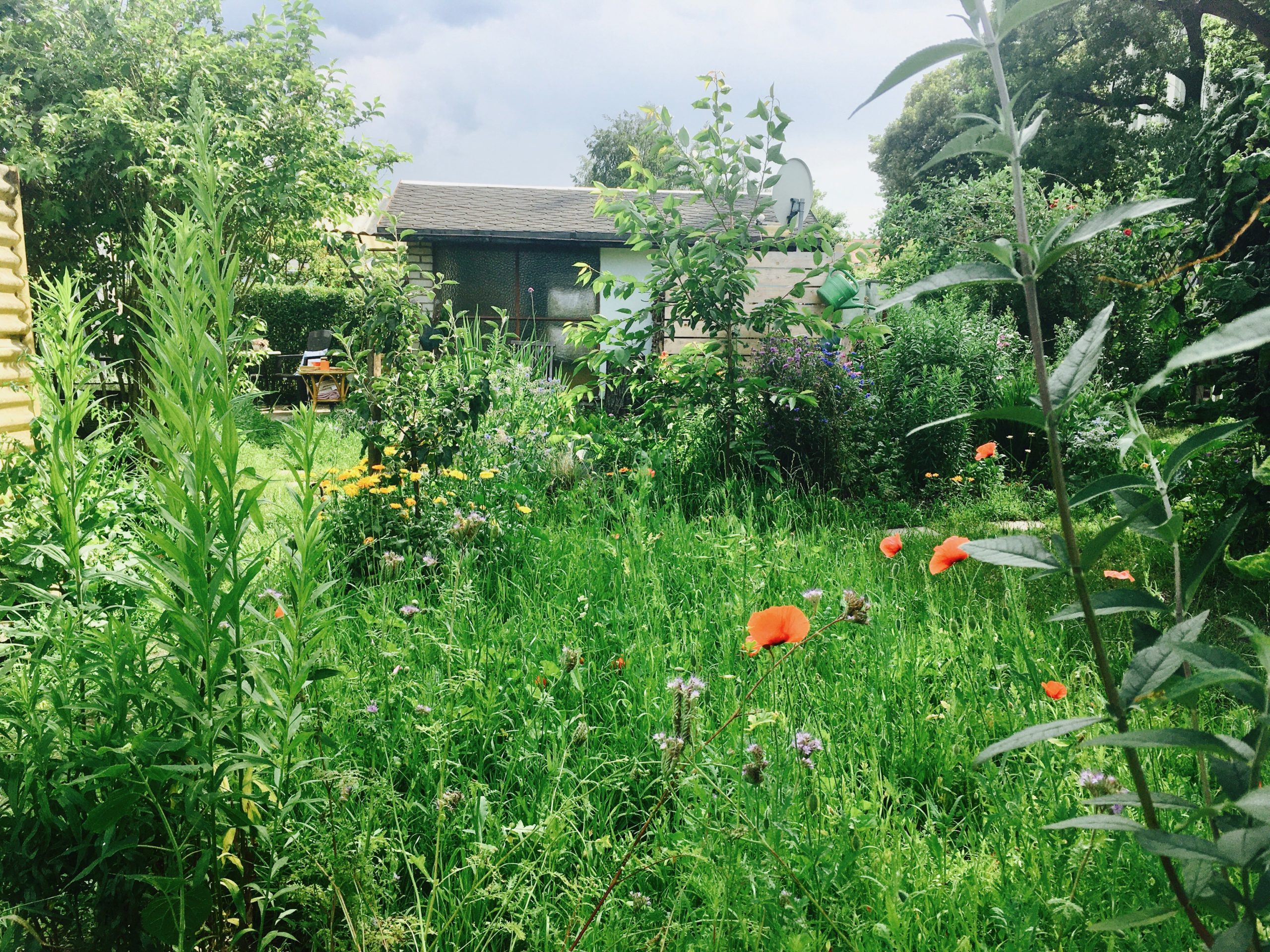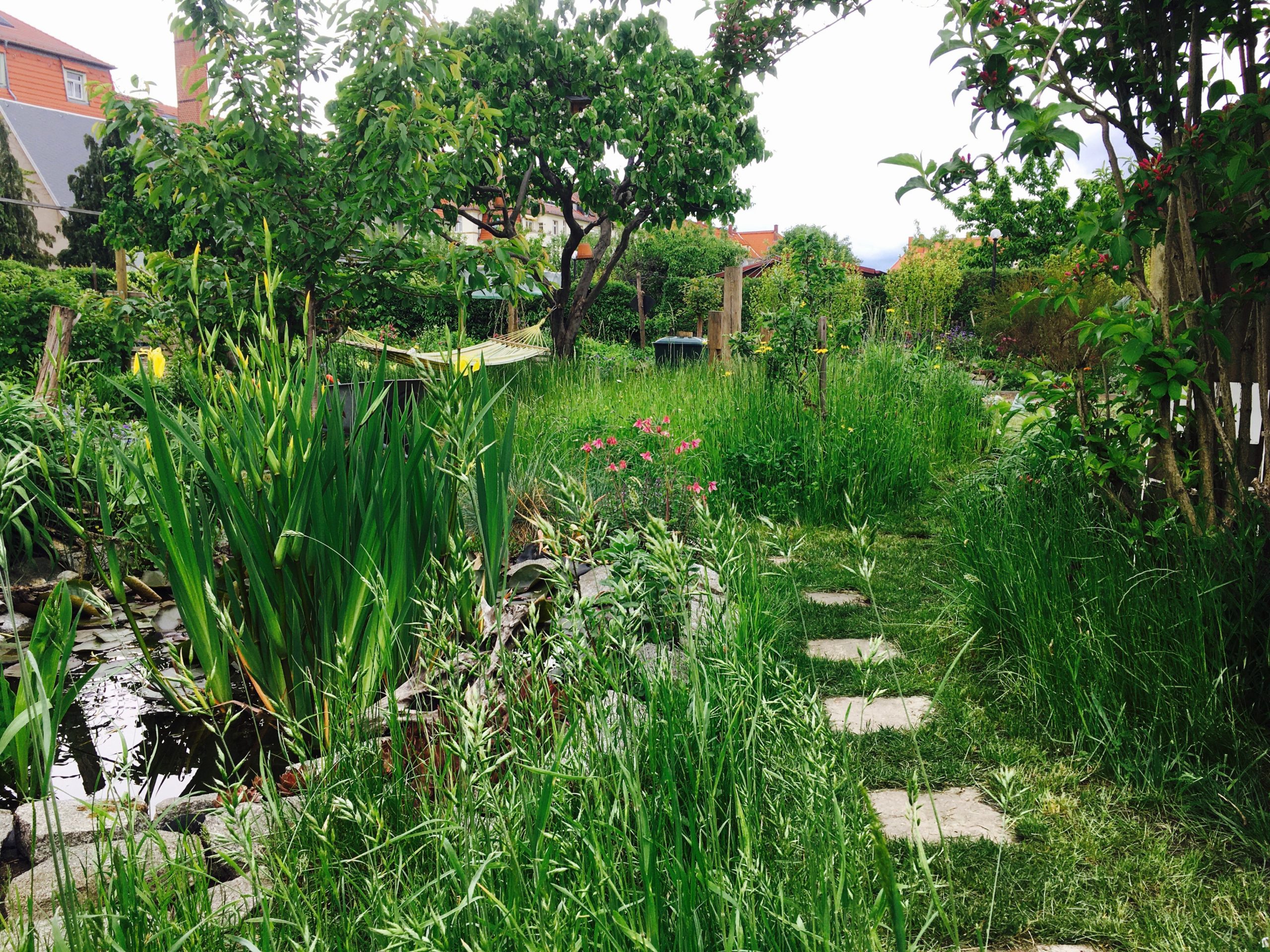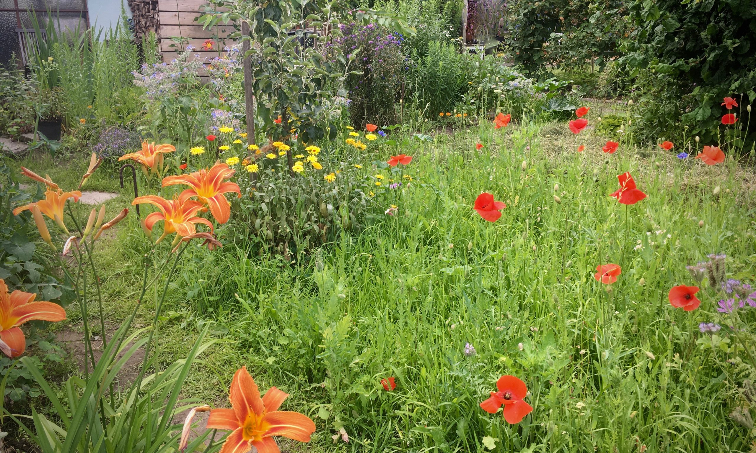 Rasen vers. Wiese. Ich, als ein Kind aufgewachsen in ländlichen Wiesenlandschaften kann mich selbst mit Fug und Recht als Botschafterin dieser langhalmigen Biotope bezeichnen. Es gibt kein höheres Glück, als in der Hängematte zu schaukeln und den Grashüpfern zu lauschen.  Aus diesem Grund bildet eine Magerwiese statt eines Kurzrasens das Zentrum meines Gartens. Ob es nun dieses ungewöhnlichen Details oder die Pflanzung von Brennnesseln als erste Maßnahme nach Gartenübernahme oder eine Benjeshecke ist – alles keine gängigen Kleingartenelemente. Aber eines ist garantiert: Man kommt darüber miteinander ins Gespräch 😉